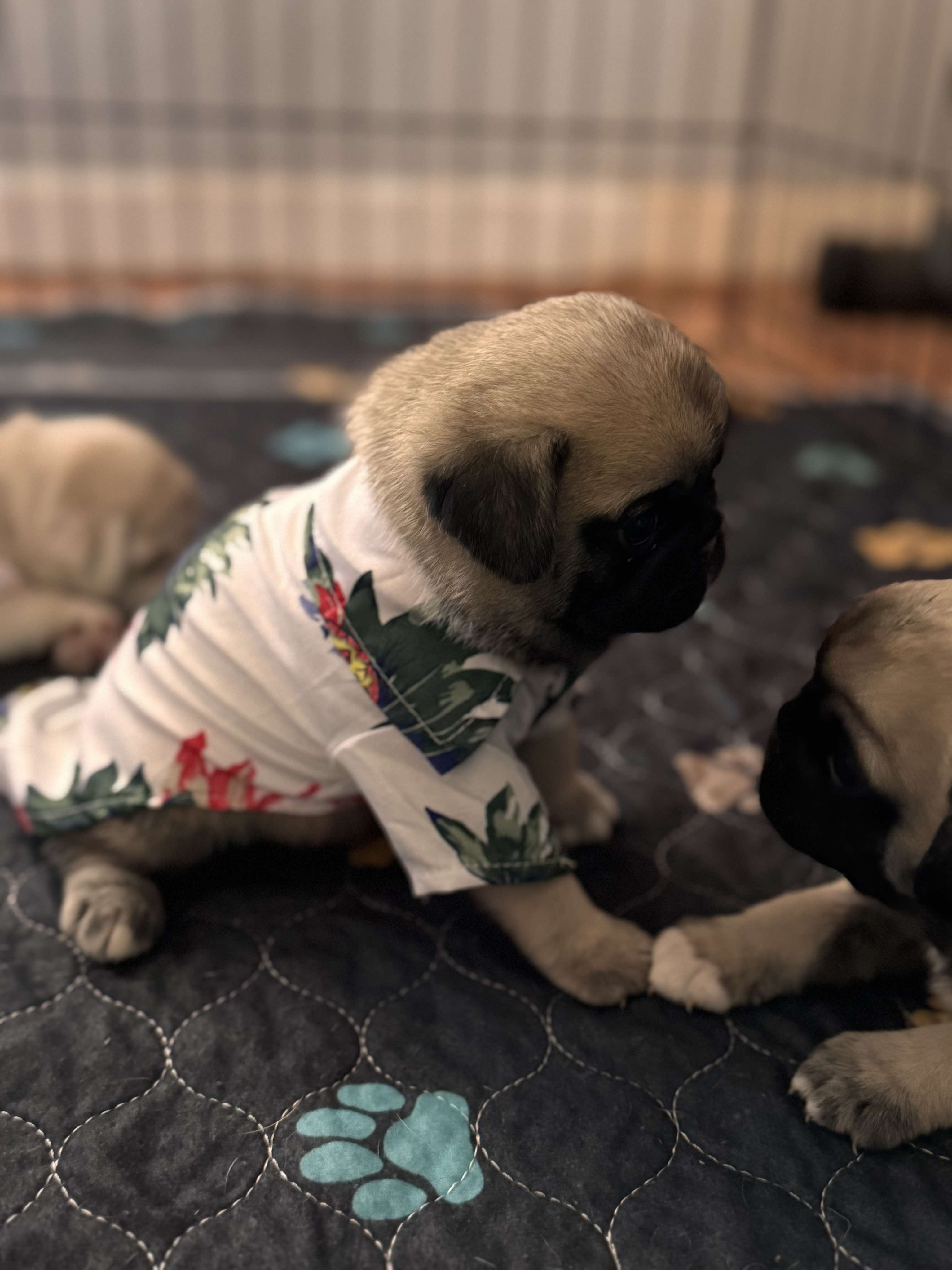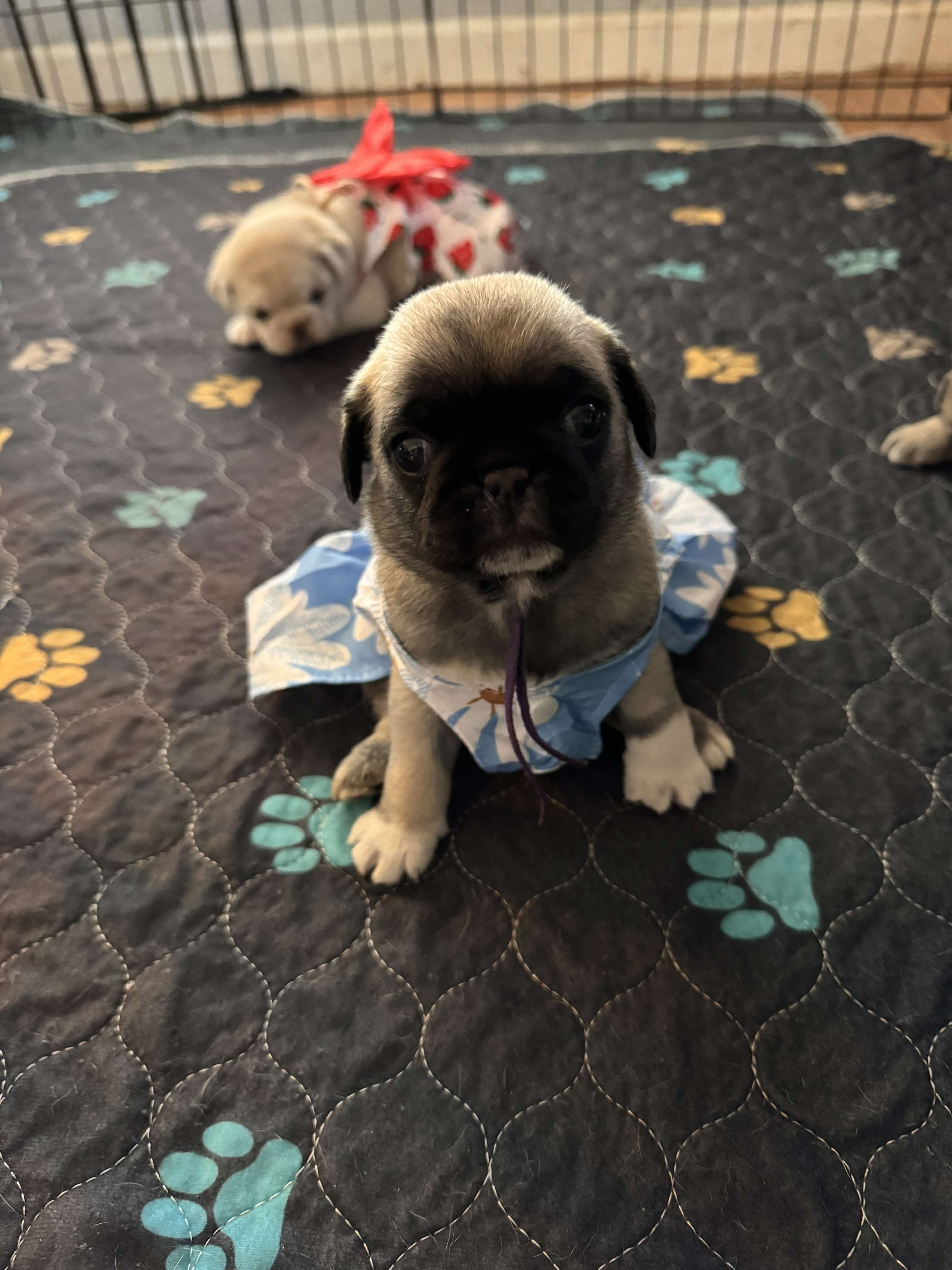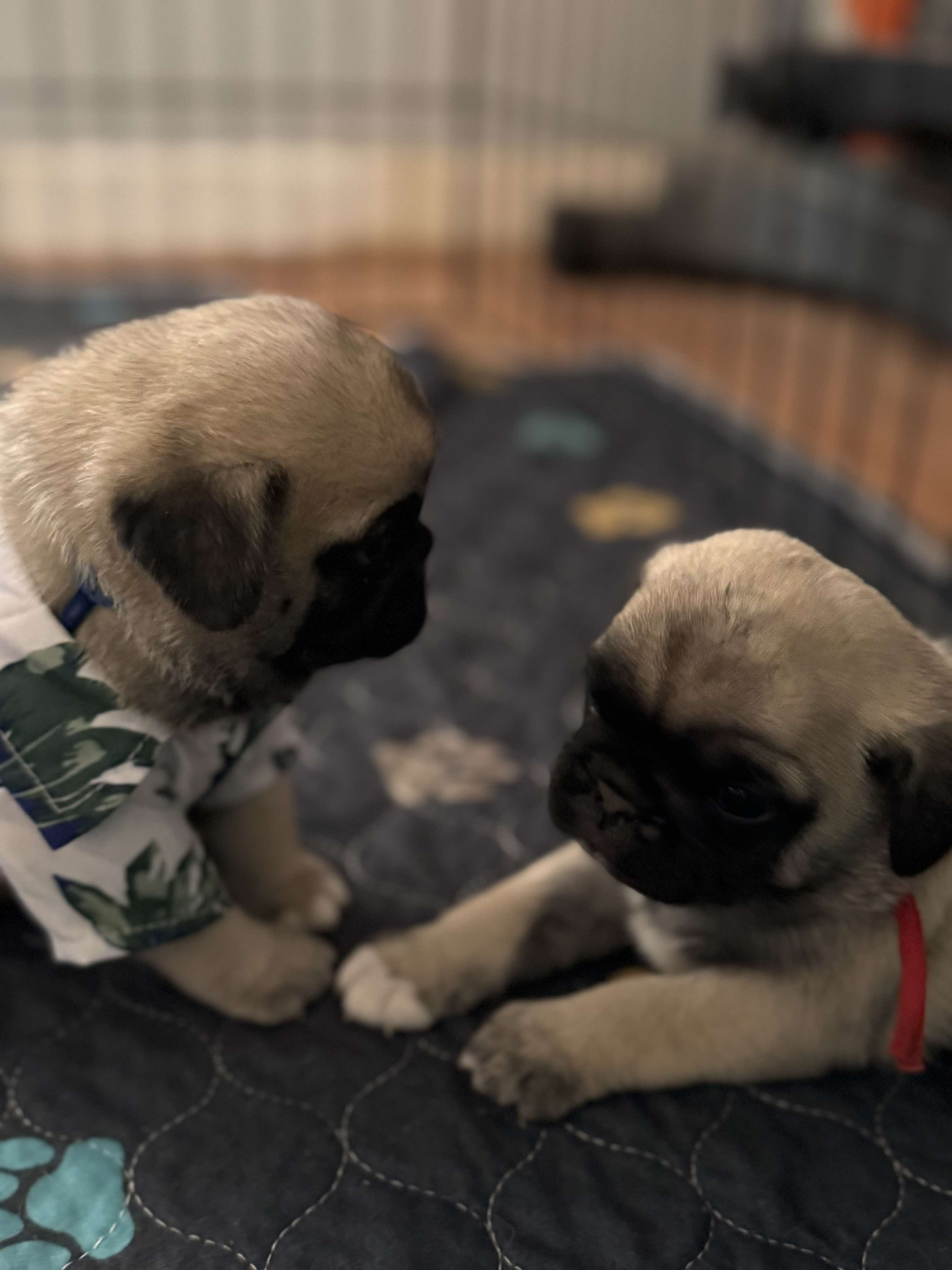 Our daughter loves to play dress up with herself, her Barbies, baby dolls, and what is better than some cute little pugs to add in there. These adorable pugs, with their playful demeanor and affectionate nature, make every dress-up session even more delightful. They are always good sports and eagerly allow our daughter to accessorize them with bows, hats, and costumes, turning each playtime into a whimsical adventure. This small time is great for their socialization, providing them with early experiences of interacting with children. We have heard so many good things about our babies in their forever homes, where they continue to bring joy and companionship to families, and how adaptable they are in various settings. It makes us proud to know that our pugs have such loving qualities and that they fit seamlessly into the lives of those who welcome them.