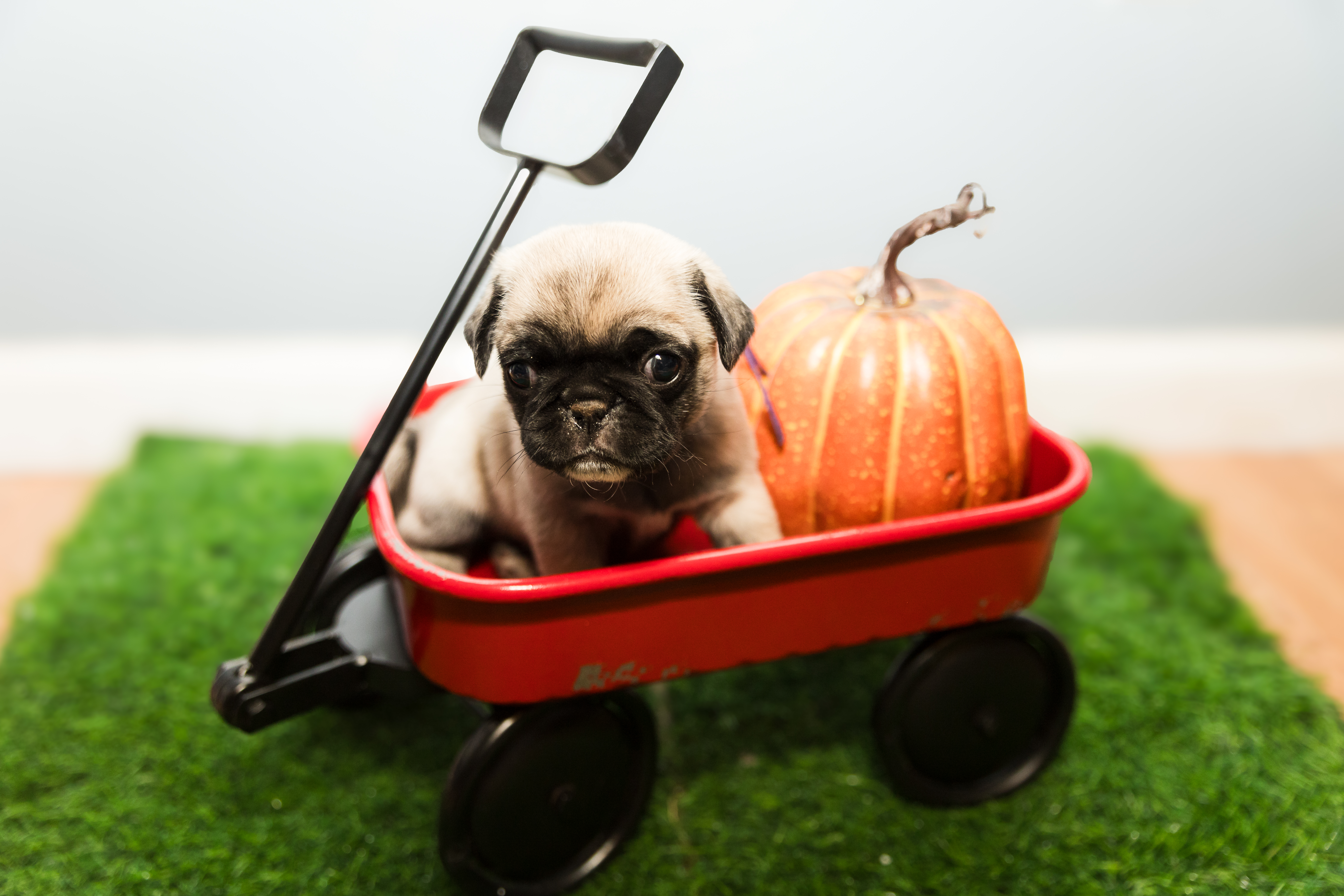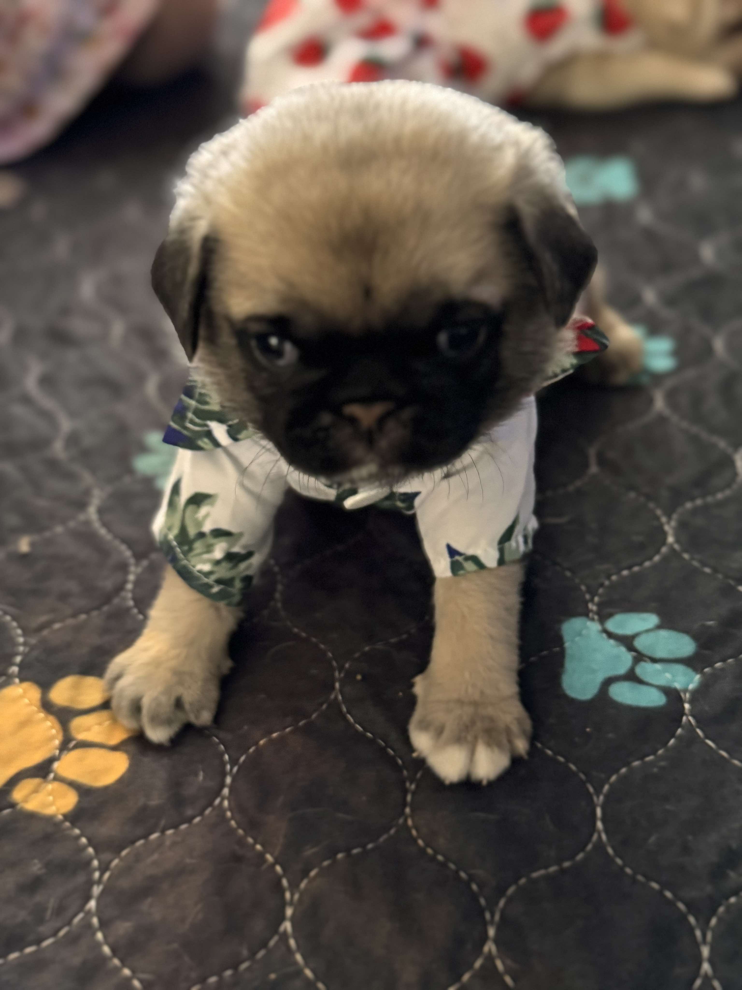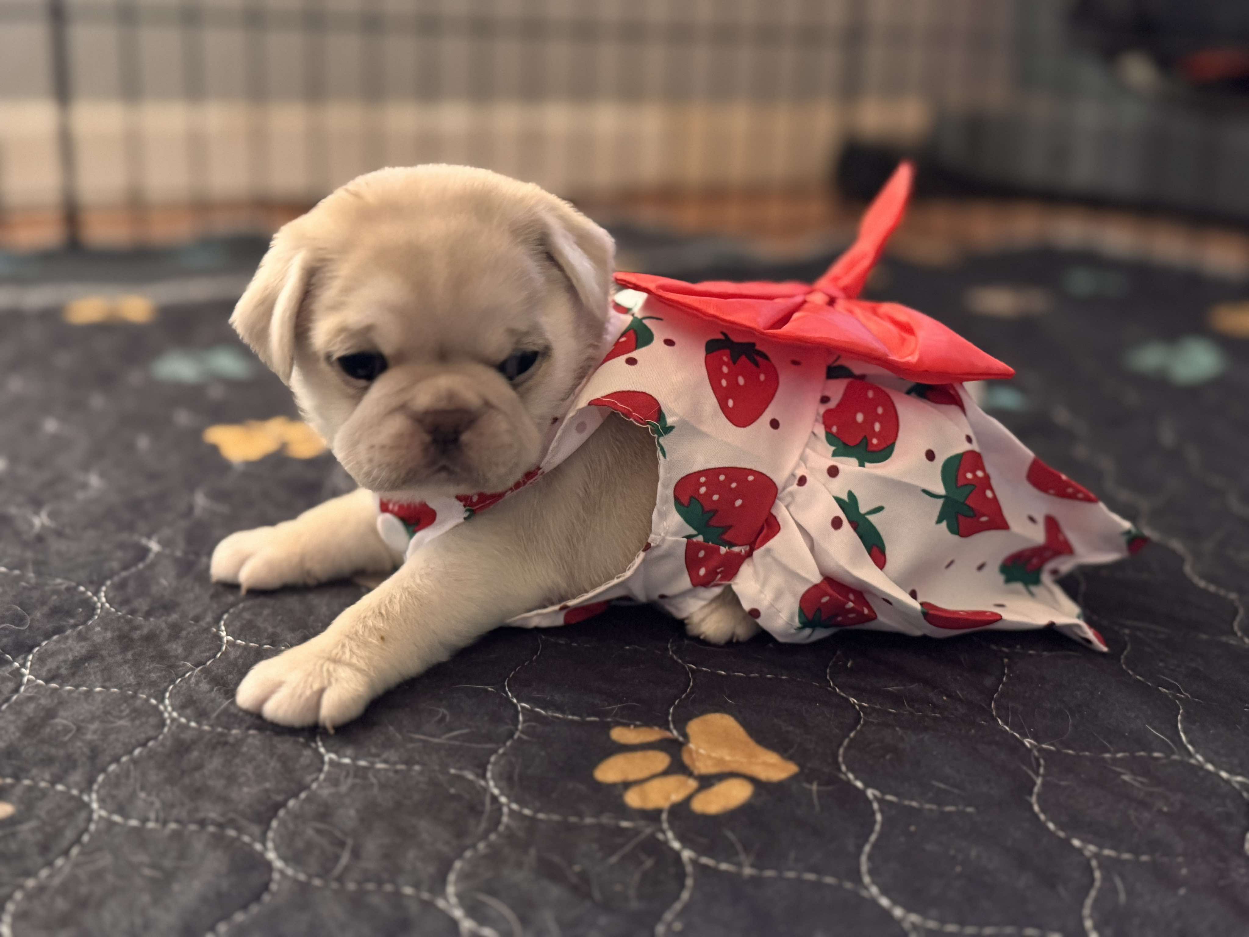 Our daughter loves to play dress up with herself, her Barbies, baby dolls, and what is better than some cute little pugs to add in there. These adorable pugs, with their playful demeanor and affectionate nature, make every dress-up session even more delightful. They are always good sports and eagerly allow our daughter to accessorize them with bows, hats, and costumes, turning each playtime into a whimsical adventure. This small time is great for their socialization, providing them with early experiences of interacting with children. We have heard so many good things about our babies in their forever homes, where they continue to bring joy and companionship to families, and how adaptable they are in various settings. It makes us proud to know that our pugs have such loving qualities and that they fit seamlessly into the lives of those who welcome them.